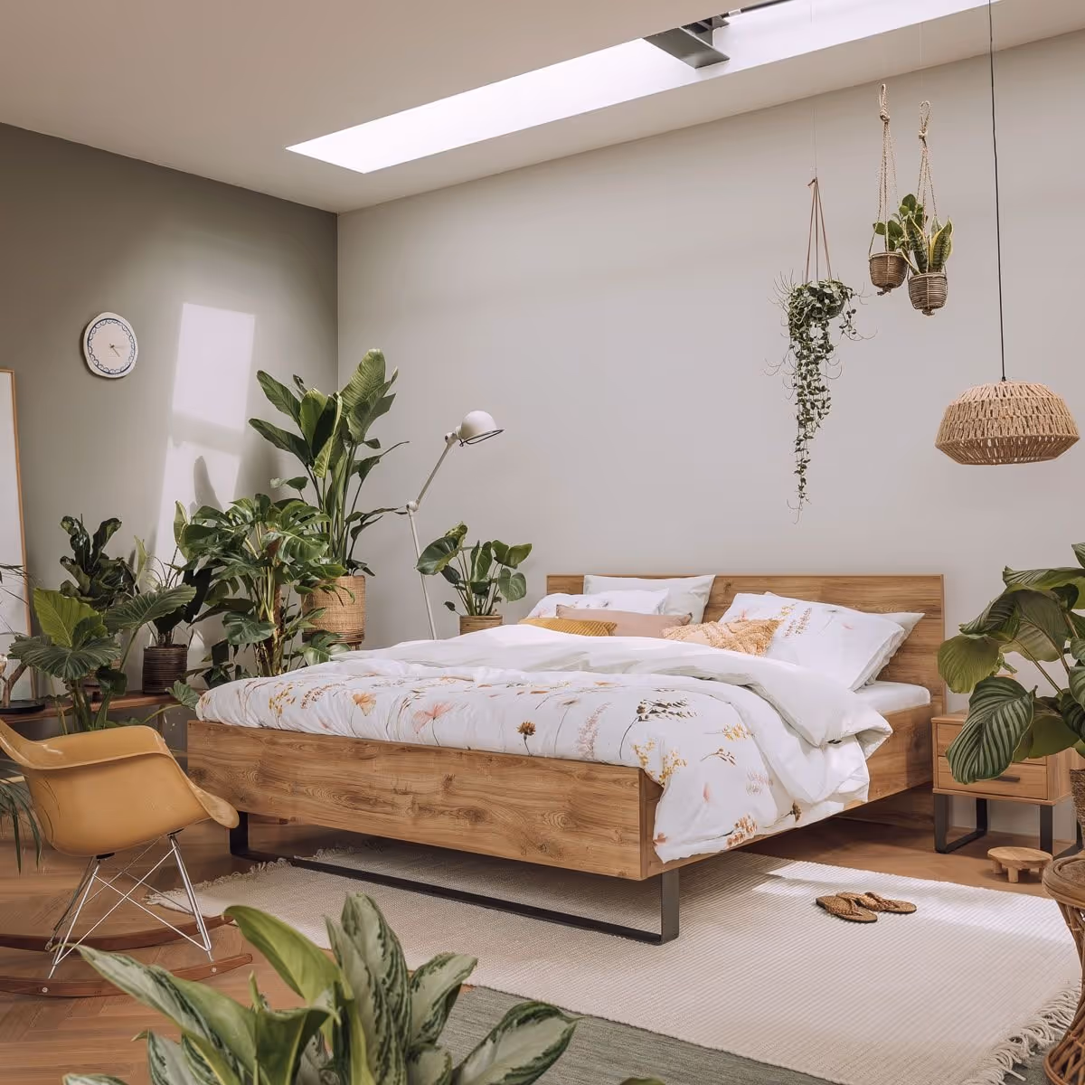 Liever geen blauw op de muren? Ook groen in de slaapkamer is een goede keus. Groen is een kleur met een ontspannende en frisse werking. Maak het geheel af door planten toe te voegen. Naast dat ze een fijne sfeer creëren zijn planten ook goed voor zuurstof in een ruimte. En voldoende zuurstof komt weer ten goede van jouw nachtrust!