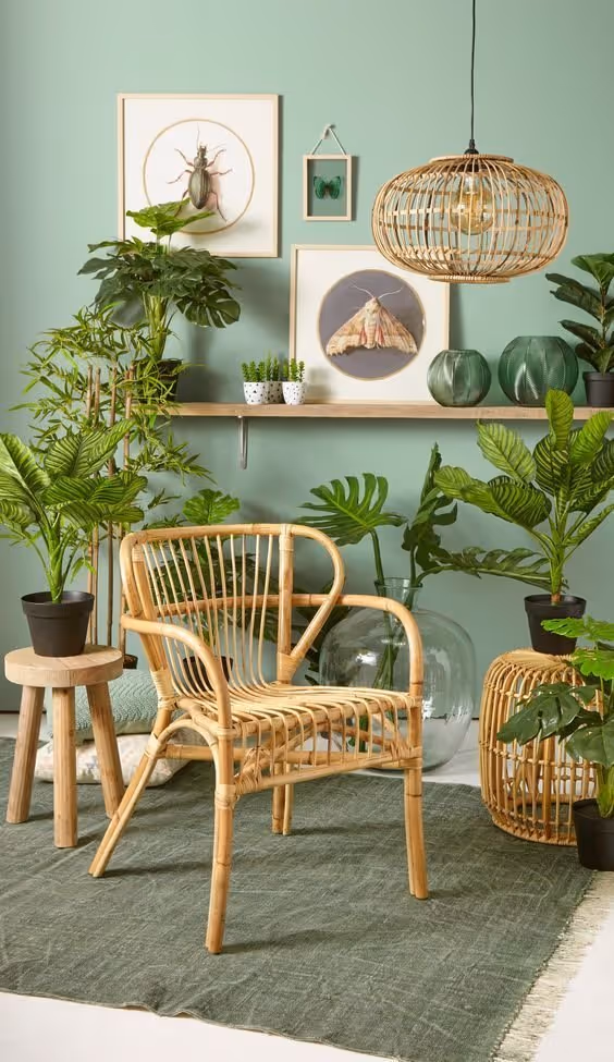 Plantengroen past bij elke interieurstijl, maar de groene kleur combineert vooral heel goed met natuurlijke tinten en materialen. Kies in een botanisch interieur bijvoorbeeld voor een rotan stoel, rieten hanglamp of jute vloerkleed om de natuurlijke sfeer nog meer te benadrukken.